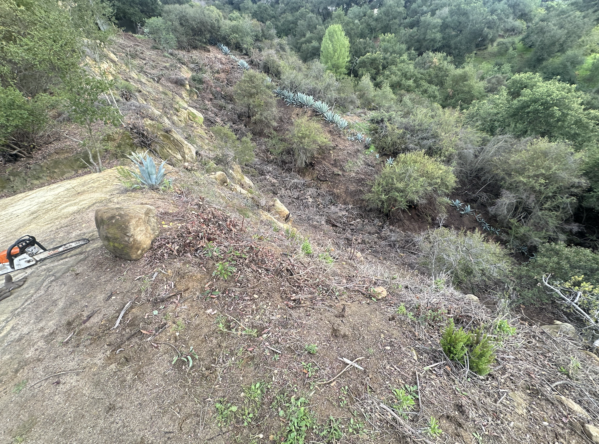But the main enemy wasn’t the snake — it was the sumac chaparral. Those plants burn like gasoline. We cut as much as we could. I ran the chainsaw myself for hours, dragging piles of branches and logs toward the compost areas we set up throughout the property. One of the goals was to reveal the old cactus line along the western border — a natural fire barrier planted years ago. Over time it had all but vanished under the brush. Pulling it back into the light felt like uncovering a forgotten shield.