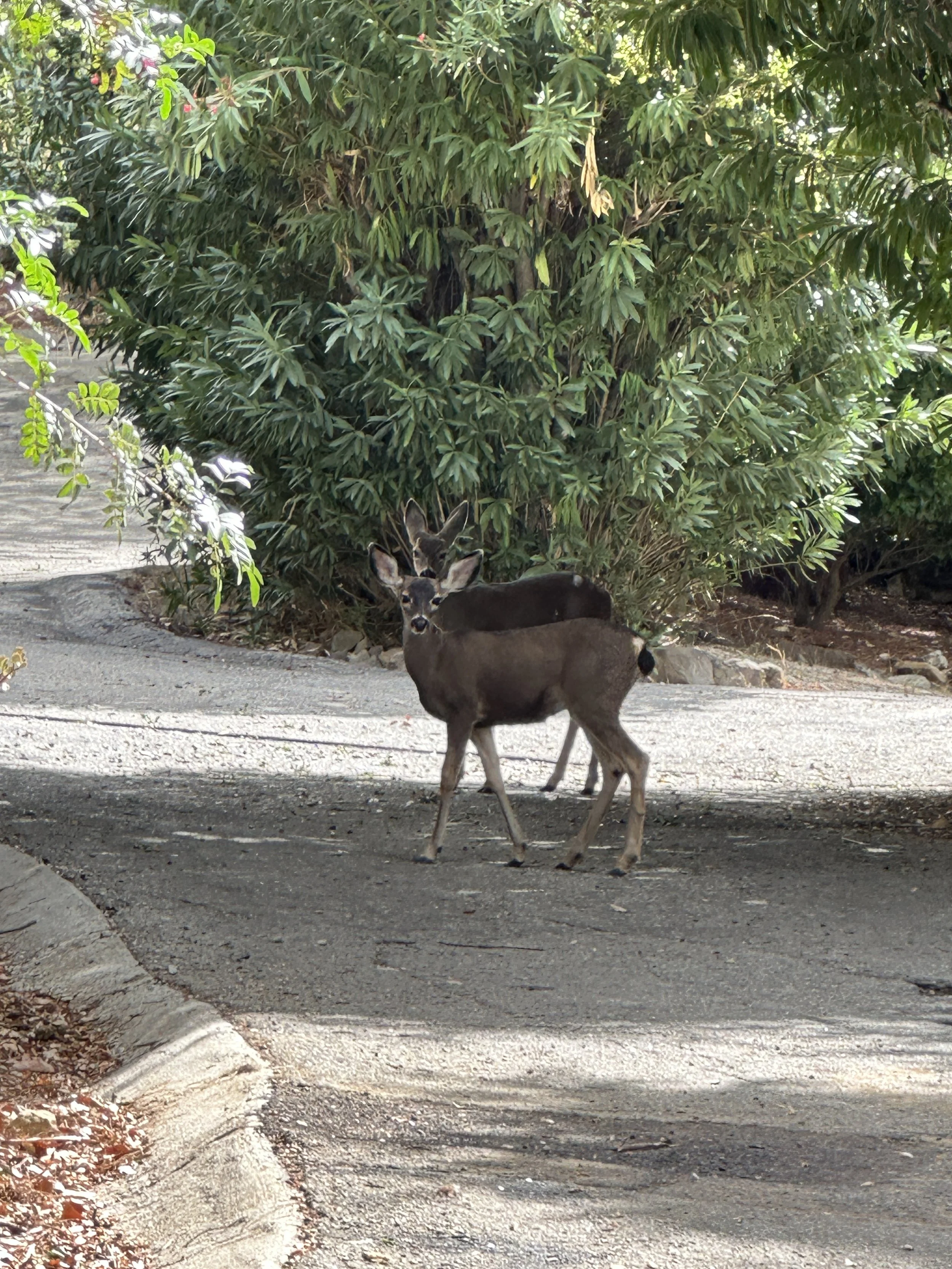 Over time, they have truly settled in. Now we see them several times a day, crossing paths as if the land were an extension of their home. Interestingly, the family seems to have divided itself into pairs. The doe and buck move together, while the two fawns wander side by side.