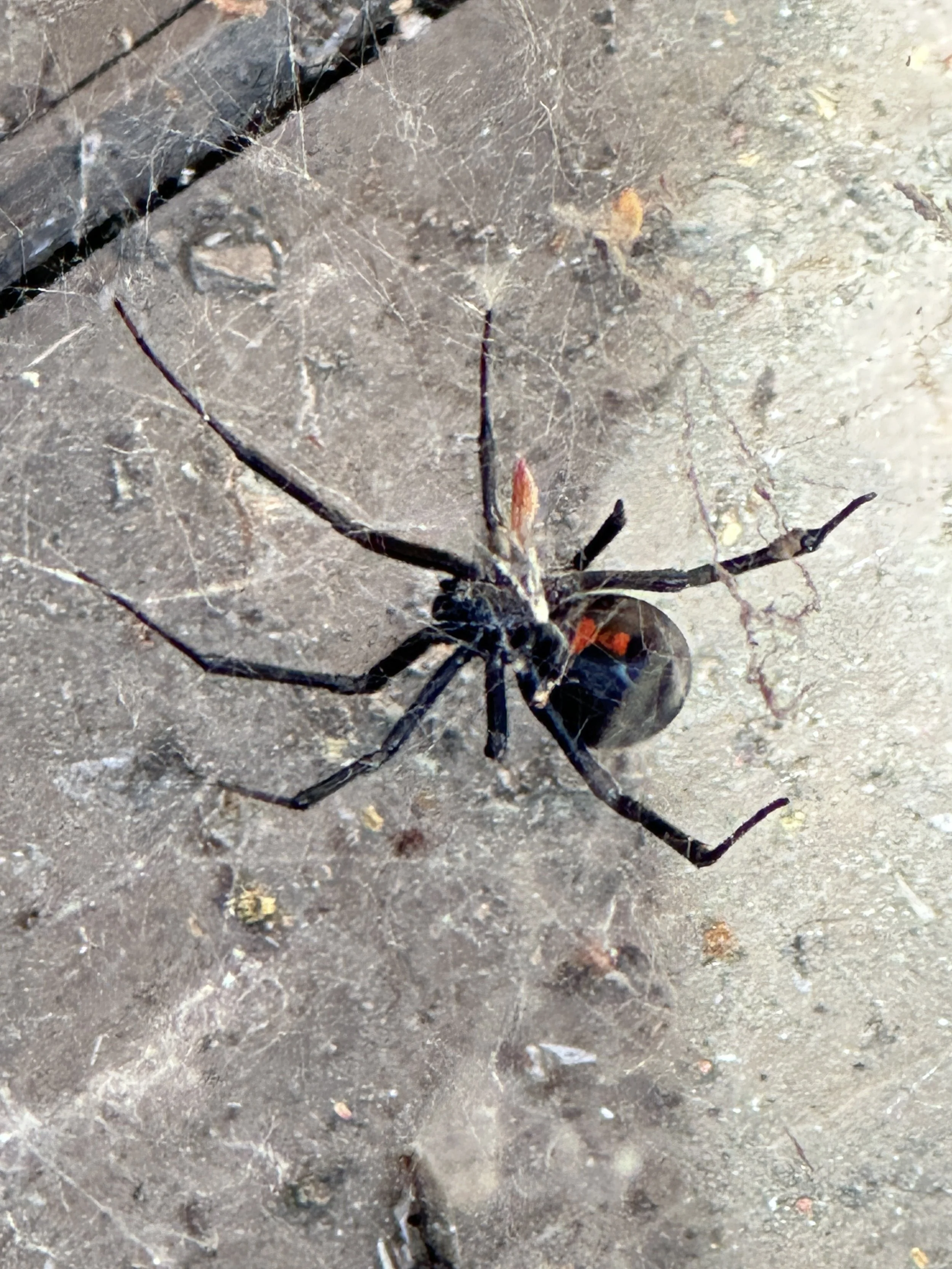 There is a black widow that has taken up residence inside an old wooden chest on the property. It used to sit beside the outdoor fireplace, until I noticed her glossy black body and the unmistakable red hourglass marking on her abdomen.