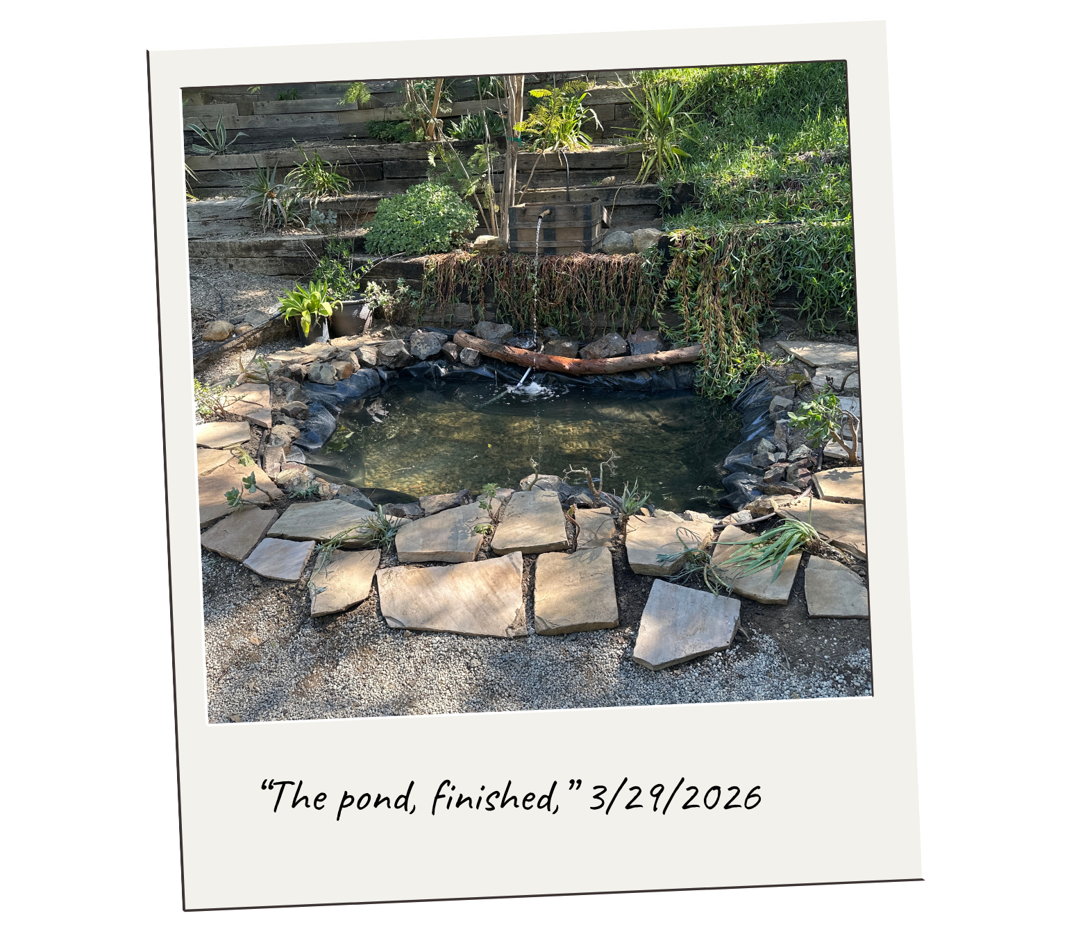 By the end of the weekend, the water was moving. A small stream began to flow from the wooden chest above, through a small bamboo pipe, spilling gently into the pond below. What had been an empty space now holds something steady.