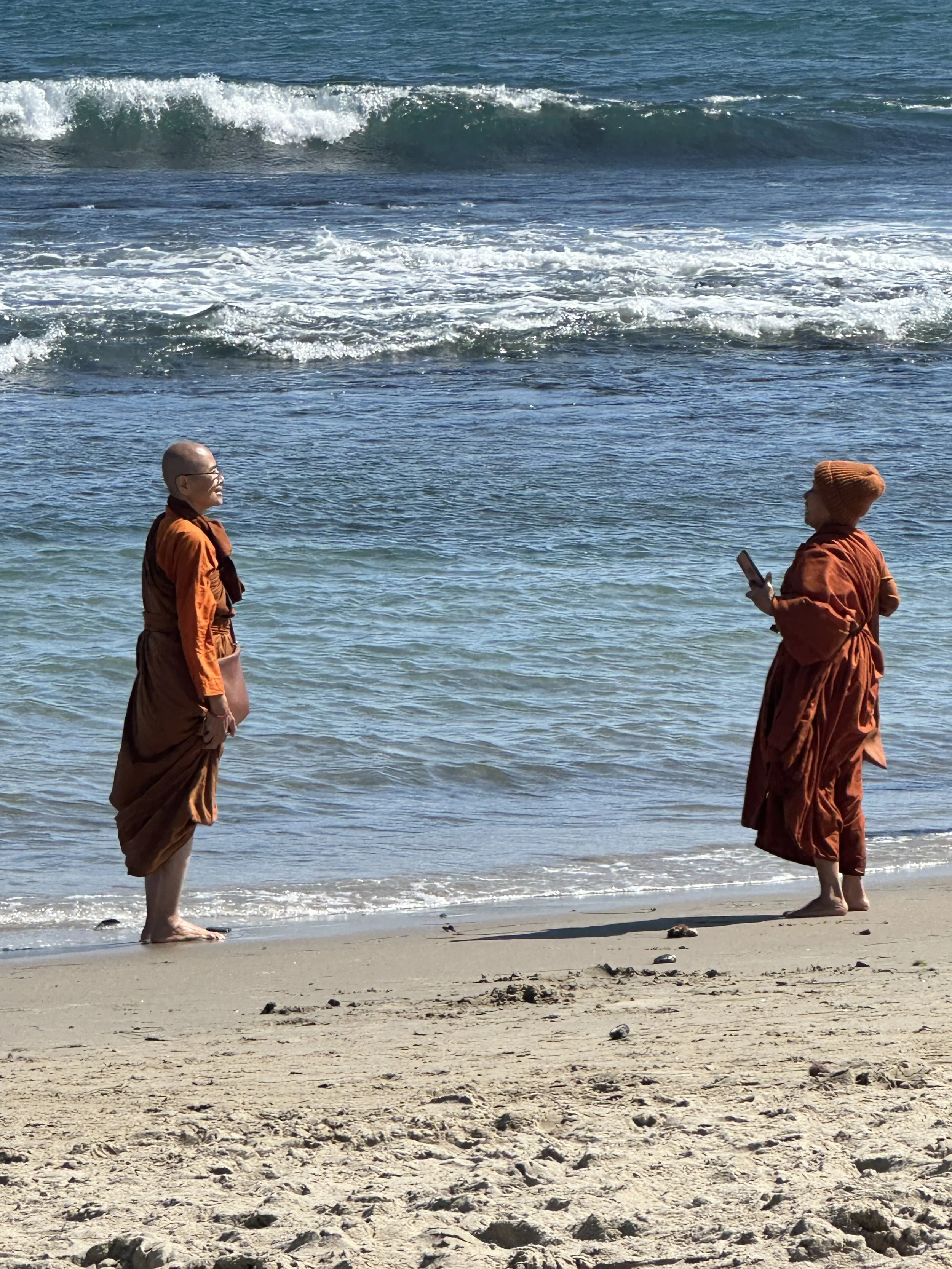 At one point, two Buddhist monks in orange robes walked along the shore. They stood out.